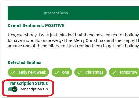 5. At the bottom left, toggle the Transcription Status to off. This will turn off closed captions and transcript on that video so people cannot see it. You can turn it back on at a later time, if you wish.