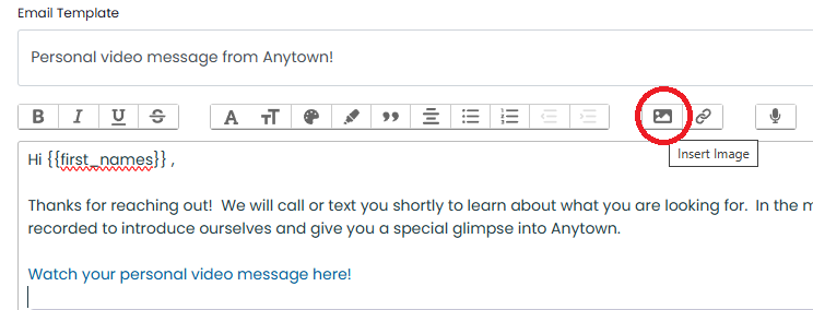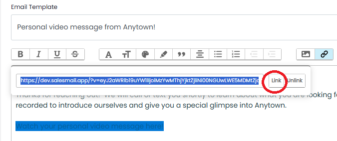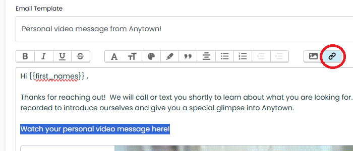 8. Go back to your Message Template in WelcomeHome and type "Watch your personal video message here!" in the body of your email. Highlight the text and click the link button above (circled in red below).