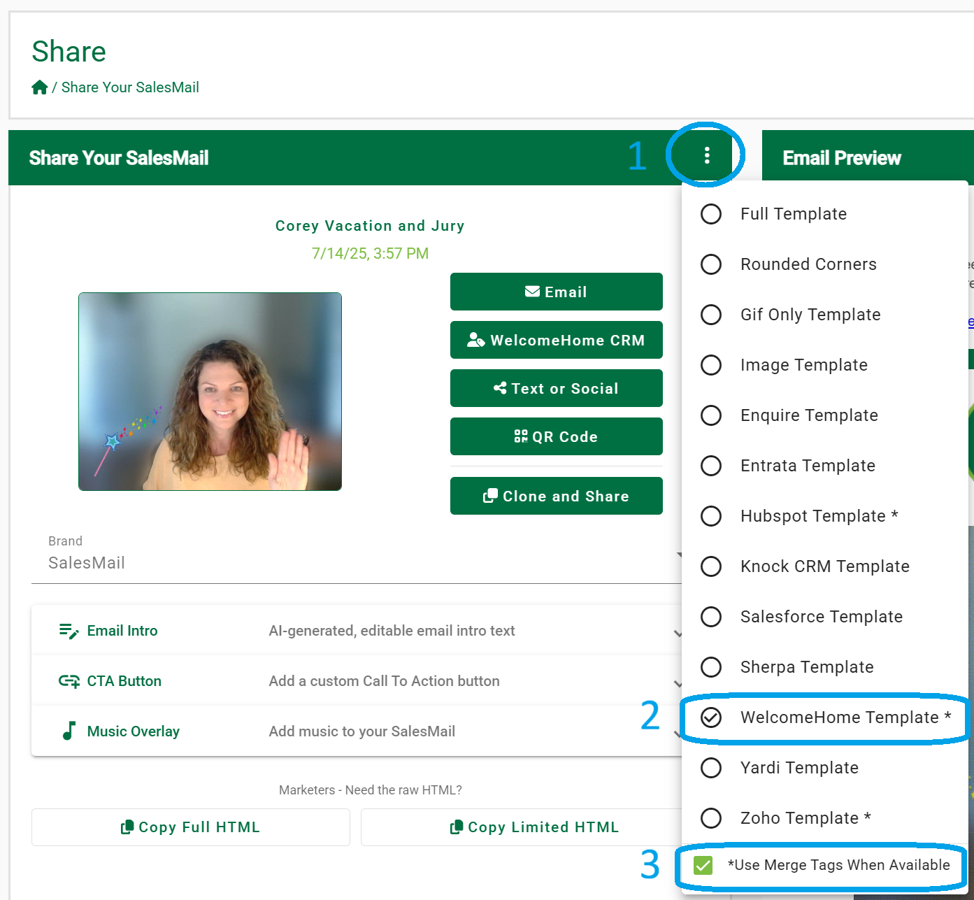 5. Click the dot dot dot menu (item 1 in screenshot below) in the 'Share Your SalesMail' section. Select the 'WelcomeHome Template' (item 2 below) and