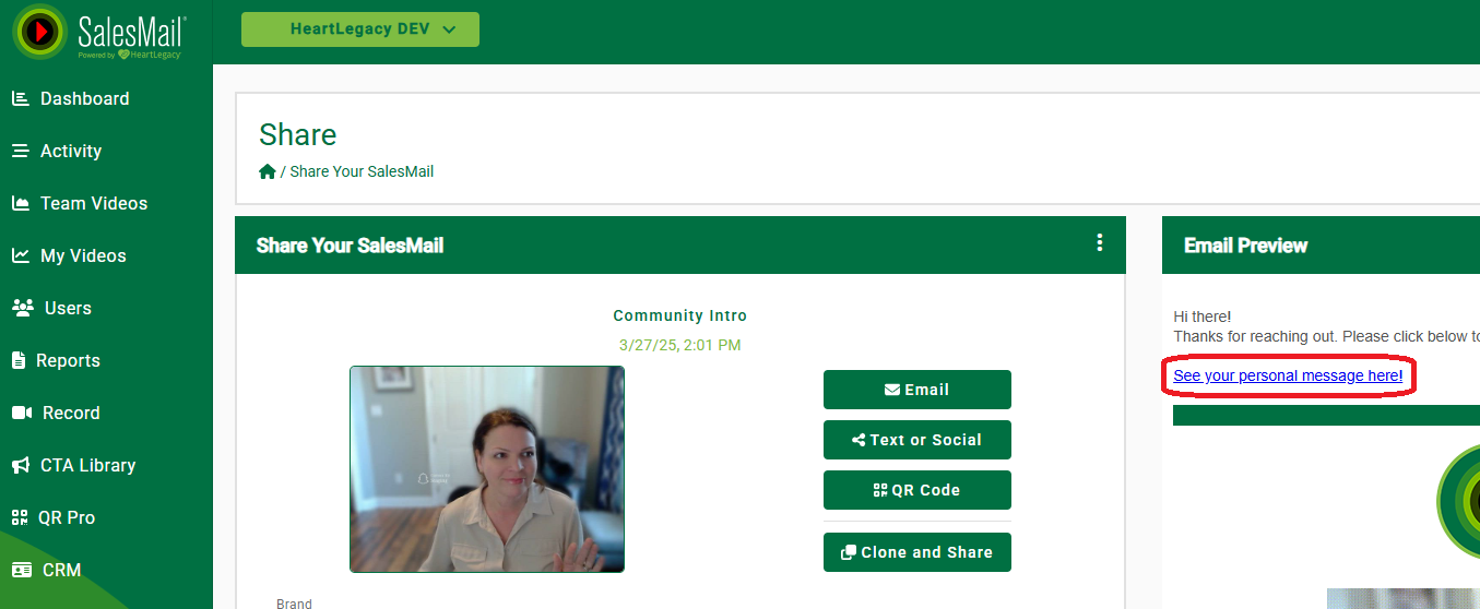SalesMail portal, go to 'My videos' or 'Team Videos' and click the share button next to the video you want to share.