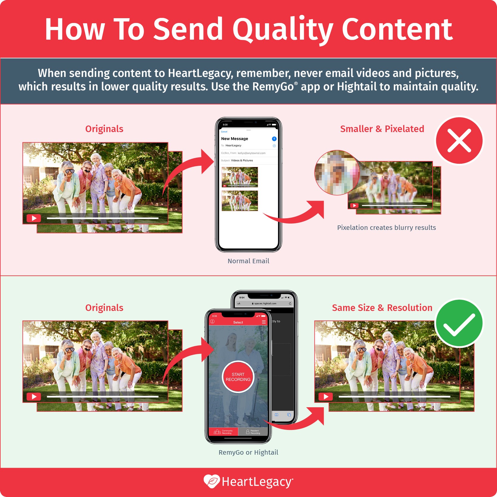 Imagine this: You and your team capture priceless photos and video footage of an amazing and emotional event at your community. Photos and videos of hugs, special moments, and laughter are just waiting to be pulled together into an amazing video to share with the world. But what could be a BEAUTIFUL video can stop in its tracks if any of those photos or videos get emailed or texted at some point on their way to HeartLegacy, rather than being sent directly from the device via RemyGo or Hightail.