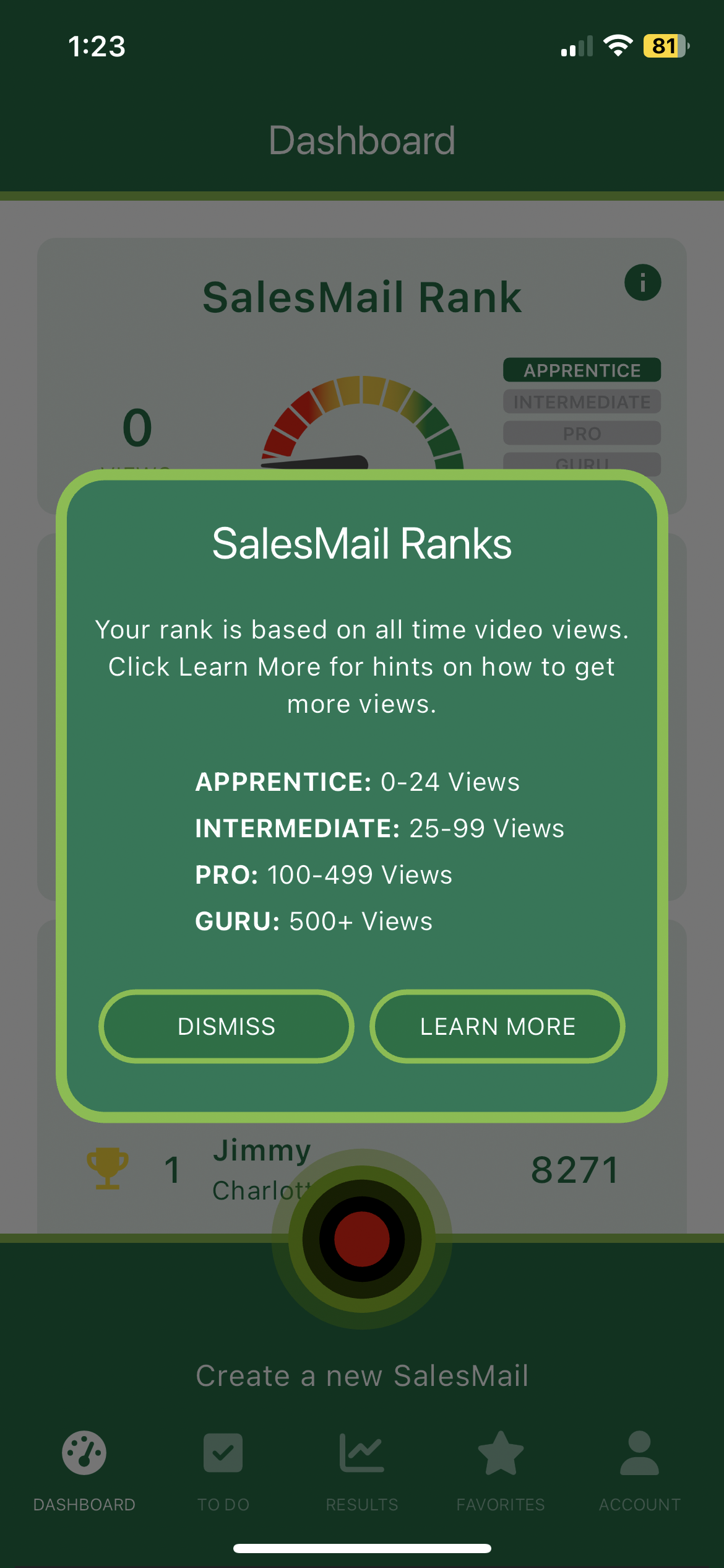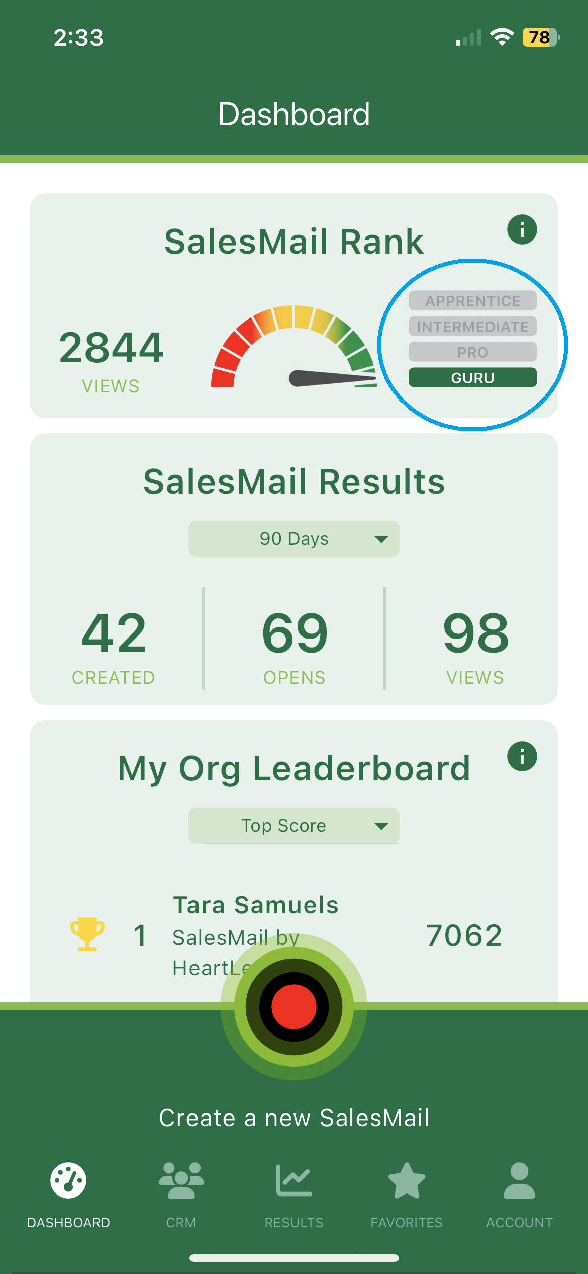 My Org Leaderboard, go to the Dashboard in your SalesMail mobile app or the