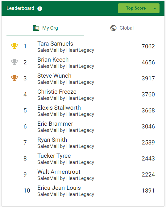 Please note that if you see the Global leaderboard, but not your My Org leaderboard, make sure you have recorded and/or shared SalesMail videos in the past 90 days and encourage team members to use SalesMail. Once at least three team members have at least 5 points, your My Org leaderboard will appear and the fun can begin!
