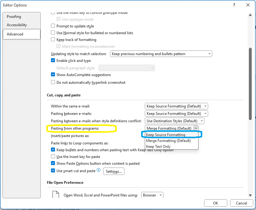 4. Scroll down to the 'Cut, copy, and paste' section and change the 'Pasting from other programs' setting to 'Keep Source Formatting' as shown below.
