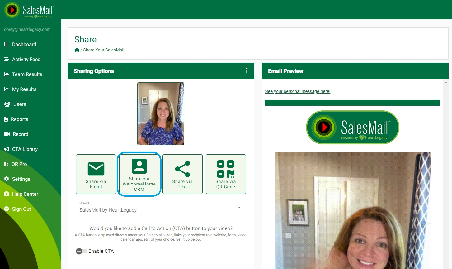 SalesMail Desktop Portal, making it easier than ever to share videos via their CRM! If you have your SalesMail CRM integration set up for one of the systems mentioned above, the button circled in blue below will now reflect the name of your CRM system*. By clicking this button, the custom SalesMail template for your CRM system will be copied for you to paste and share SalesMail videos in messages generated in your CRM. You can also see a preview of your template in the 'Email Preview' box on the right. This new button and custom template is in addition to any bidirectional integration you may have already been using in your SalesMail mobile app. Please note that if you will be sharing via a text message generated from within your CRM, you will use the 'Share via Text' button instead.