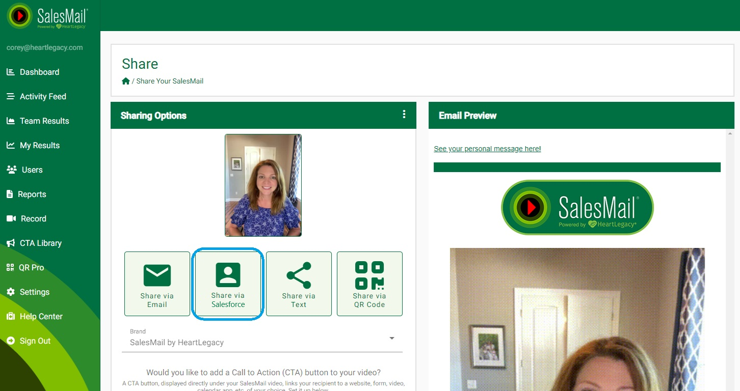 SalesMail Desktop Portal, making it easier than ever to share videos via Salesforce. If you have your SalesMail CRM integration set up for Salesforce, the button circled in blue below will say Share Via Salesforce*. By clicking this button, the custom SalesMail template for Salesforce will be copied for you to paste and share SalesMail videos in messages generated in Salesforce. You can also see a preview of your template in the 'Email Preview' box on the right. Please note that if you will be sharing via a text message generated from within Salesforce, you will use the 'Share via Text' button instead.